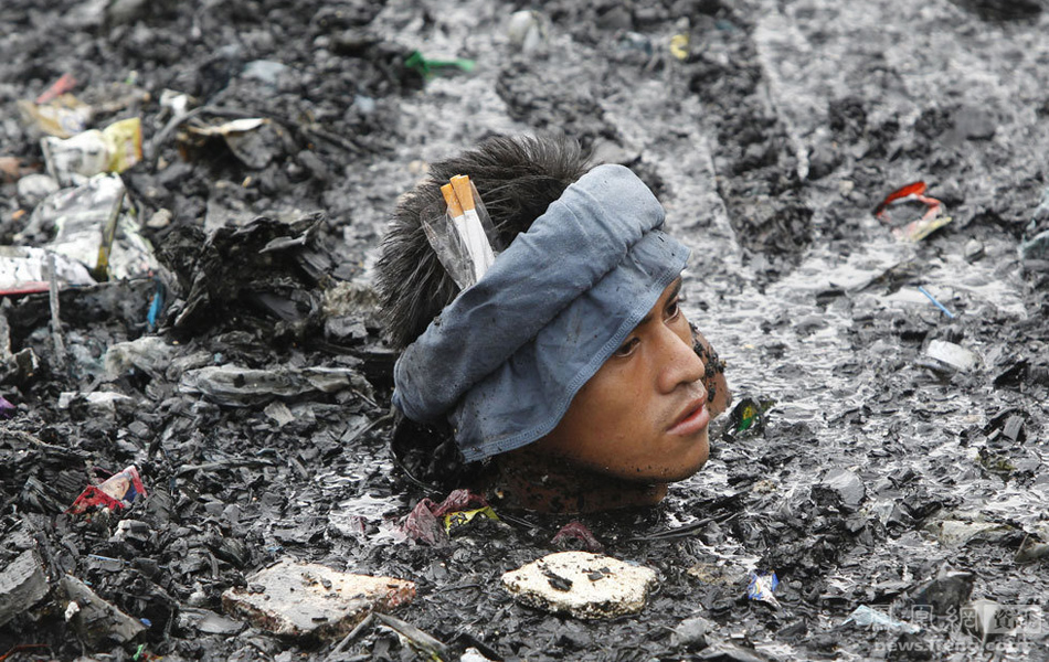 2011年4月7日,一名男子在被大火后的废墟中寻找值钱东西。菲律宾马尼拉南部马拉邦市一海岸村庄当日发生大火 ...