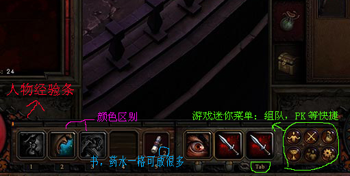 3.快捷栏:当前能使用的技能,在快捷里按彩色显示.而快捷里的其他暂时无法使用技能按黑灰色显示.