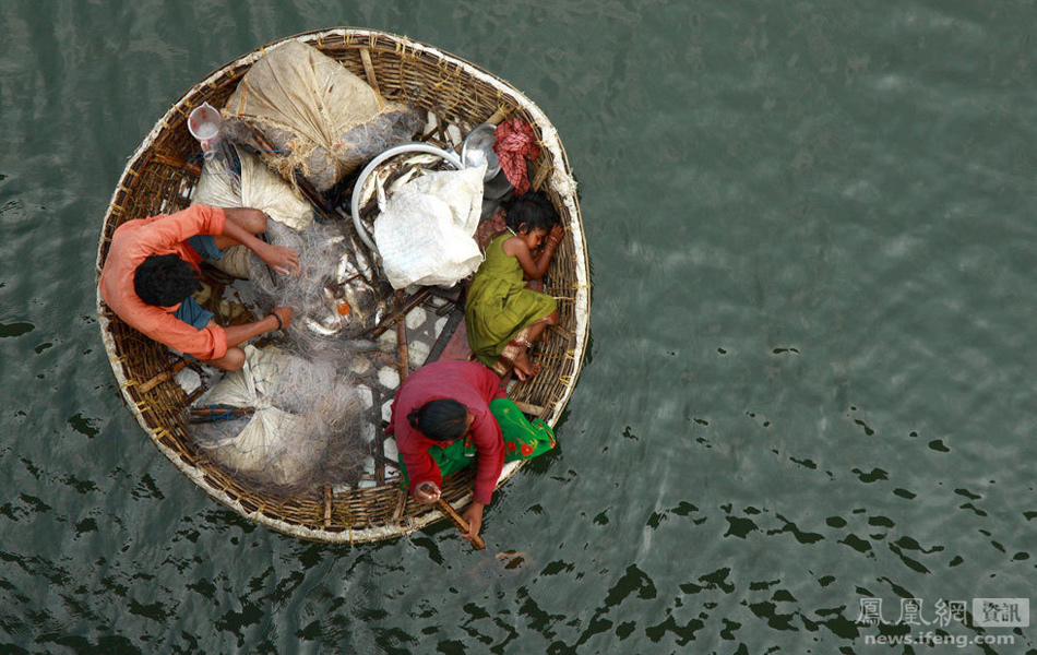 2011年1月5日,印度南部城市Kochi,Periyar河上温馨的一家三口,丈夫整理渔网,妻子划船,孩子沉入梦乡。