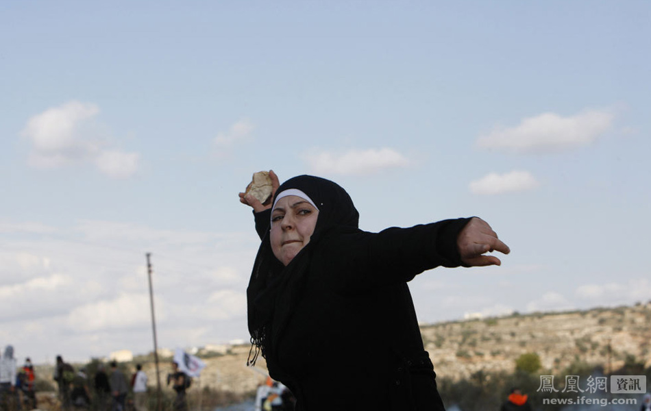 2011年1月7日,拉马拉地区,一名巴勒斯坦妇女向以色列士兵投掷石块。