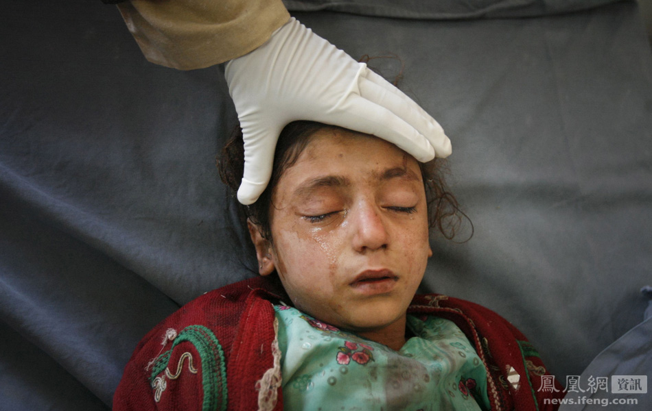 2011年2月9日,巴基斯坦白沙瓦,一名在炸弹袭击中受伤的女孩在医院接受治疗。