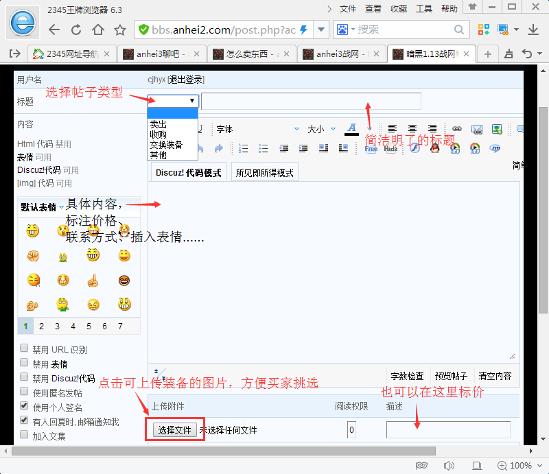1.卖方先在所在交易区发一个出售帖,明码标价。