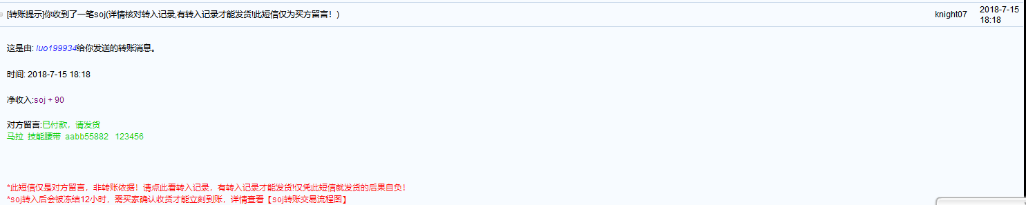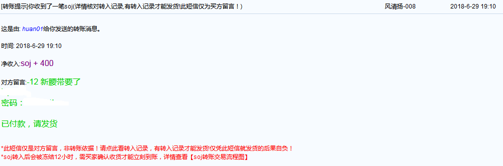 买新腰带,支付400 SOJ 交易时间为:6月29号19点10分