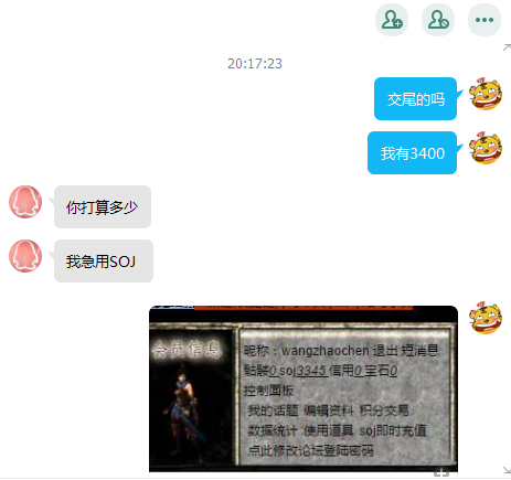 卖家以卖我无限为名欺骗我SOJ,我给卖家打钱3200SOJ后卖家没有发货,并且QQ不在说话~~即且没有退款。联系信息请看裁图