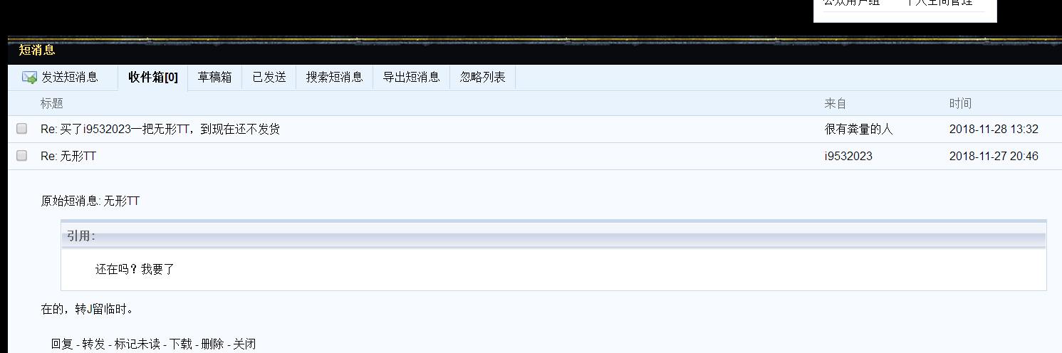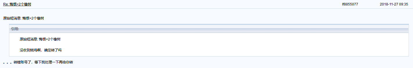 原帖由 eyesonu 于 2018-11-28 18:58 发表 申请返回SOJ: 1.卖家论坛用户名:i9532023 2.SOJ已转时间: 已超过20小时 3.取消交易的理由: 卖家在收到SOJ超20小时后还没有发货;且没有退款。交易前联系过卖家才转账,联系信息请看裁图