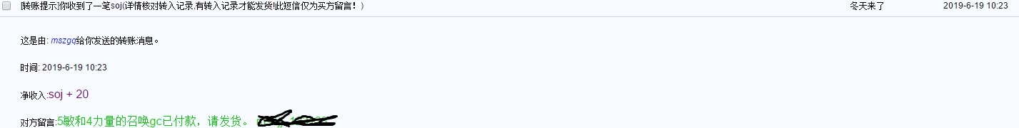 Re: [转账提示]你收到了一笔soj(详情核对转入记录,有转入记录才能发货!此短信仅为 ...        gsk384026446        2019-6-20 00:10