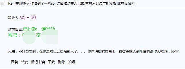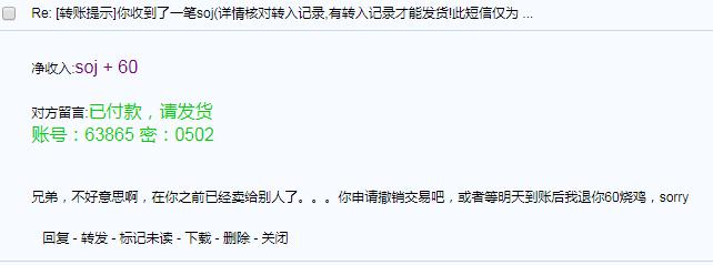 原帖由 qiang63865 于 2019-12-30 18:46 发表 1.卖家论坛用户名: ydstar 2.SOJ已转时间: 已超过3小时 3.取消交易的理由(请根据下面3种情况选写1种,含其他需要的说明):对方以将物品卖给别人