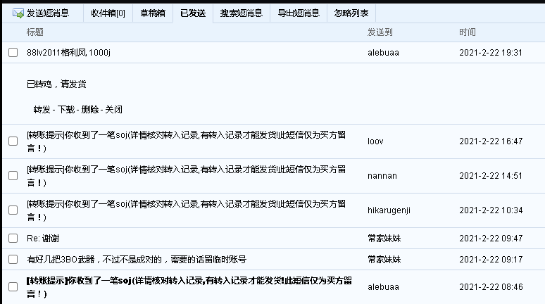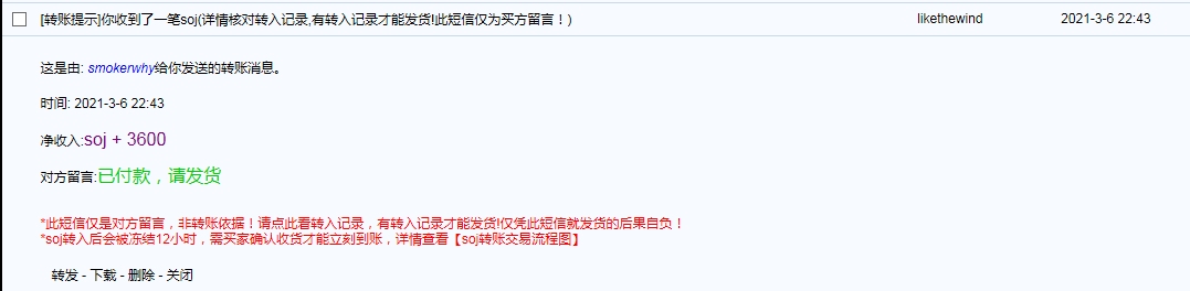相应处理/处罚:如果买家事先未联系卖家就转账,买家在投诉前必须先用论坛短信联系卖家,标题可以是请及时交易或返回SOJ之类。短信发出的8小时内没收到回复才能在本帖申请返回SOJ(将联系卖家的短信裁图后发在回复里)。申请后SOJ会先冻结2天,2天后才能正式申请返回。