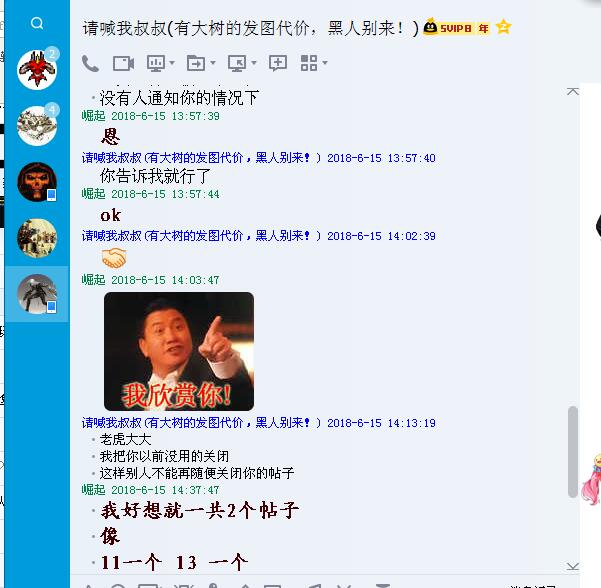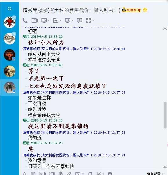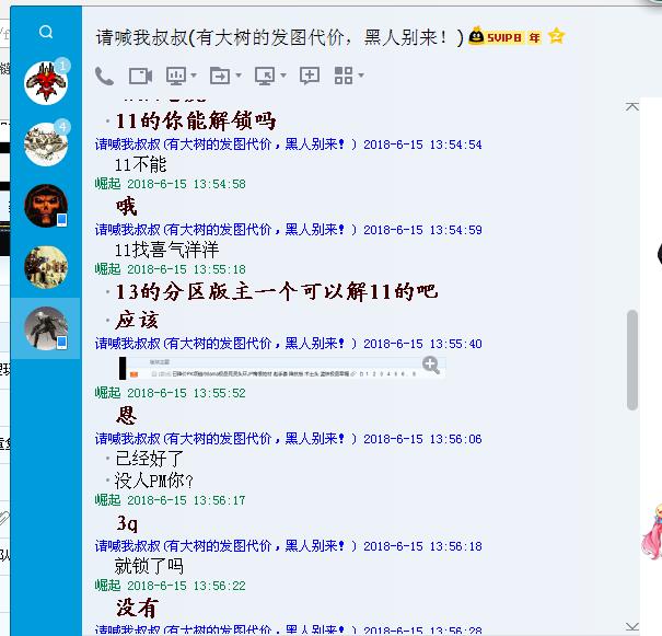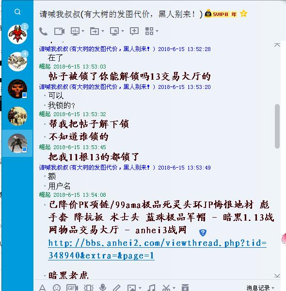 2018 6月份我1.11跟1.13交易区卖装备帖子无缘无故被锁(1.11跟1.13我都有号两边都在玩), 我问过其他交易区版主都不是他们锁的 这个除了GM跟分区版主可跨区锁帖外我想没其他人了,还有你锁帖也的按版规行事吧的PM楼主是什么原因锁的吧,没有给出任何原因也没有短消息通知就这样锁了,后来找色叔叔给解锁的,上次本打算找GM投诉的 想想算了 这次又来 你真的是一人之下万人之上了 可以为所欲为无视版规 只要你高兴就可以在论坛随意针对他人是这样吗大分区版主daikai?下面有我叫色叔叔在6月份给我解锁的聊天记录。