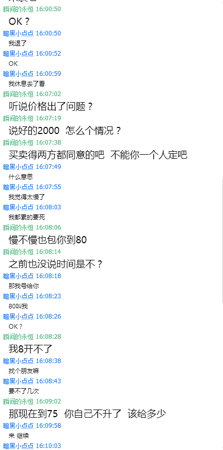 60带到75  说好累,算了,我和他要尾款,他就不给,说是之前给了1000不少了,交易是双方同意的,你一个人就定了?