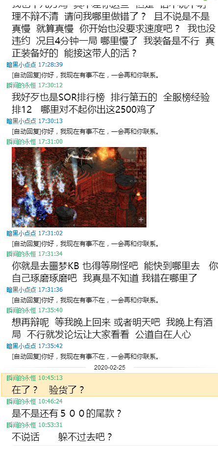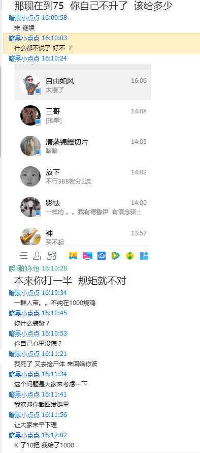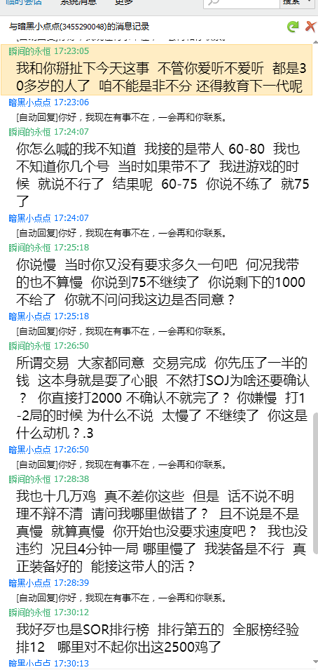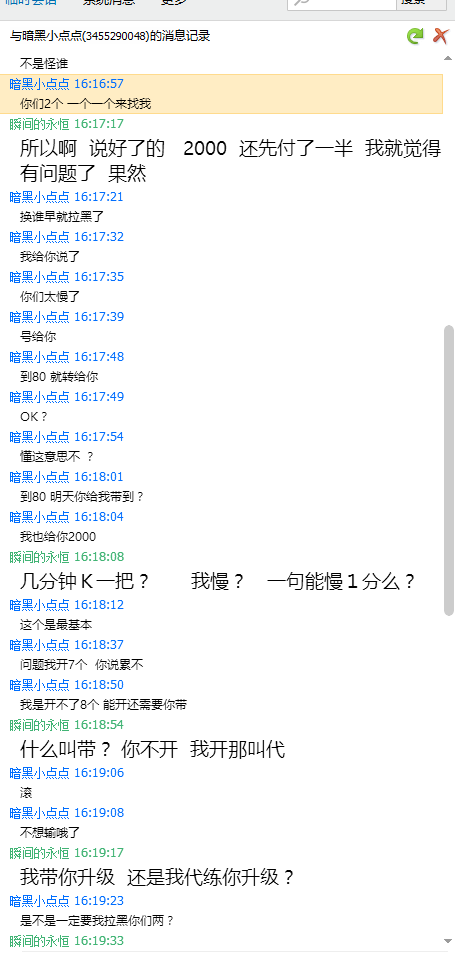 昨天下午和我一起玩的朋友给我接了个1带7KB升级的活,60-80对方喊价2000我接了,但是对方先是只给了一半打了1000的