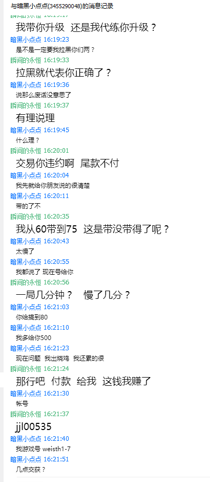 然后在QQ找此人结尾款,一通的和搅蛮缠,最后定的是我代他升级,我喊人帮他开号,给他练到80 他多给500