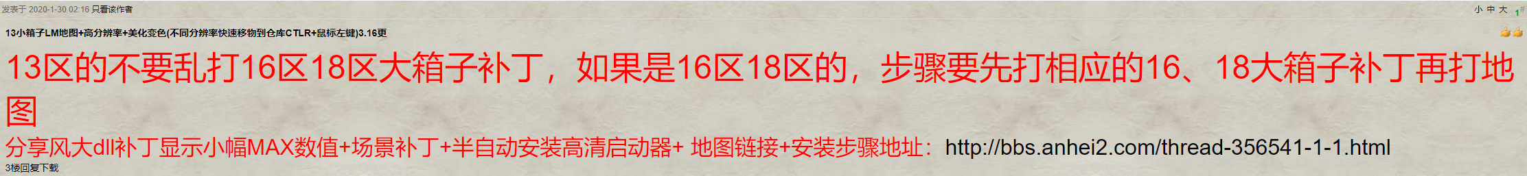 我最大的配合就是把其中一个帖链接,分享风大dll补丁显示小幅MAX数值+场景补丁+半自动安装高清启动器+ 地图链接+安装步骤,的放到13地图帖子里,之后是转地图区也好推荐区也行,让我重新上传图片,我去哪里找旧图,我还要一个一个复制很辛苦的