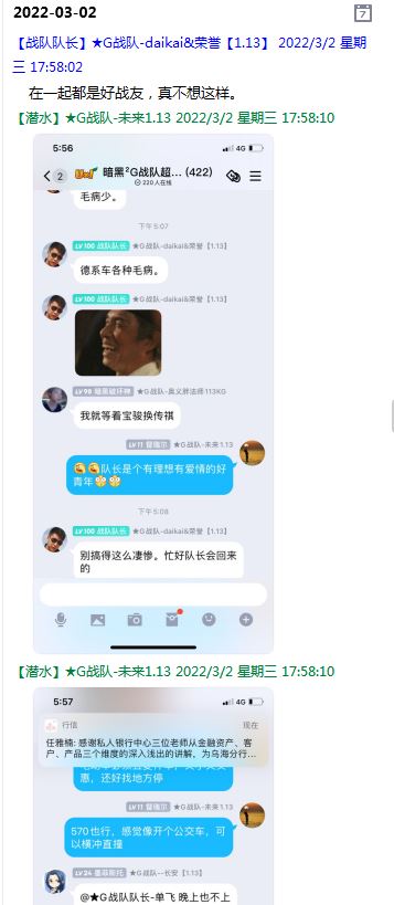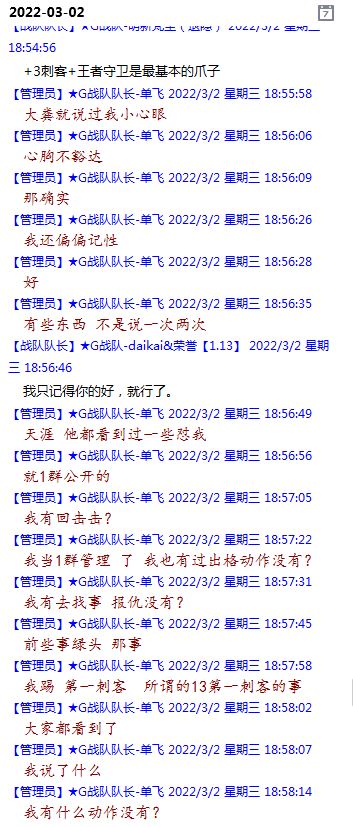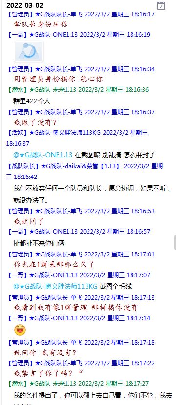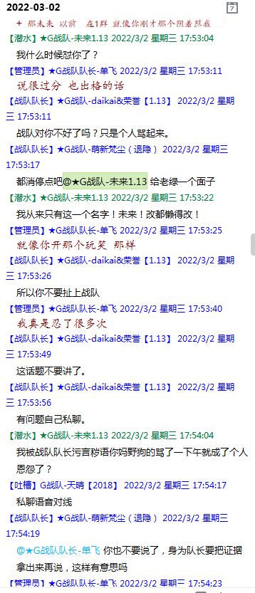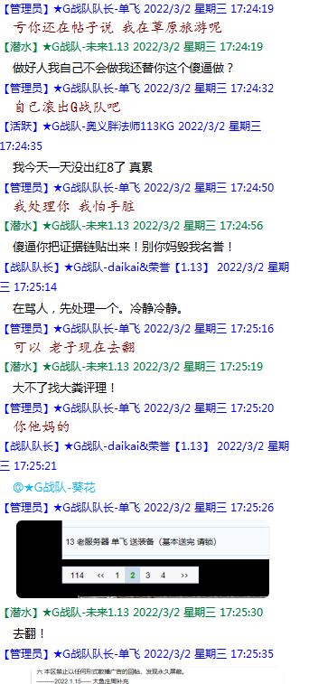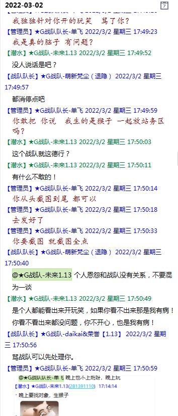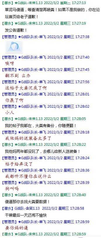 今天下午上班时,偶然看了眼手机,G战队群单飞@所有人发布了一条消息,大意就是他因为工作暂时离开群里,不再玩游戏,我看到群消息也凑了下热闹,调侃了一下单飞,队友挽留他忙工作可以晚上玩游戏,我说他忙着找对象,生猴子,这样的玩笑话是个人我想都知道是在开玩笑,结果引来单飞污言秽语,问候我家人的恶毒辱骂,并且持续到晚上6点半,一开始我还是蒙圈状态,开个玩笑不至于吧,我说话不好听,他开不起玩笑我挨骂是我活该,问候家人就不对了吧?开始我还是忍耐的,毕竟我错在先,先调侃了他。后来他污言秽语不断我才开始跟他对骂,也慢慢明白点他为什么要骂我:单飞说我曾经坑一个网名叫多情游侠的一个119ed,其他全满属性的卓古拉手套,还说我抱大腿,我都不知道我抱了哪位大佬的大腿了,绿野仙踪?跟我关系特别好的好像只有这一位,其他都是请教或者讨论问题,要么就是帮助我以后的新人。我也至今不明白他说的是什么时候到事情,到底是我弃游的这两年内发生的事,还是3,4年前?那会我进入G队了吗?在游戏里我一直用的都是G战队名字的人物,送新人装备,带新人PASS,KB升级,也做了不少贡献,也曾经因为信任大佬,对虚拟资产不是很在意,在请教大佬搭配人物装备后密码都不改,丢过身上最贵的装备气的差点弃游,我没捐过款,没交过队费,之前玩的时候我太穷,想要的装备都买不起,直到20年3月退游日子也过的紧巴巴的,但是从来没做过对不起队里的事情,也没有坑过新人。论坛里最初账号是qq12321,大概是19年3月份注册的账号,同年大概6月左右自己攒钱买了第一个无限以后重新注册了现在这个账号shmulm,并支持大粪充值100元,再无其他账号!单飞说我四年前坑的,四年前23018年我连粪网都不知道如何去坑?一年后的3月我才加入粪网,又不记得什么时候才加入G队,我如何在18年坑人?
