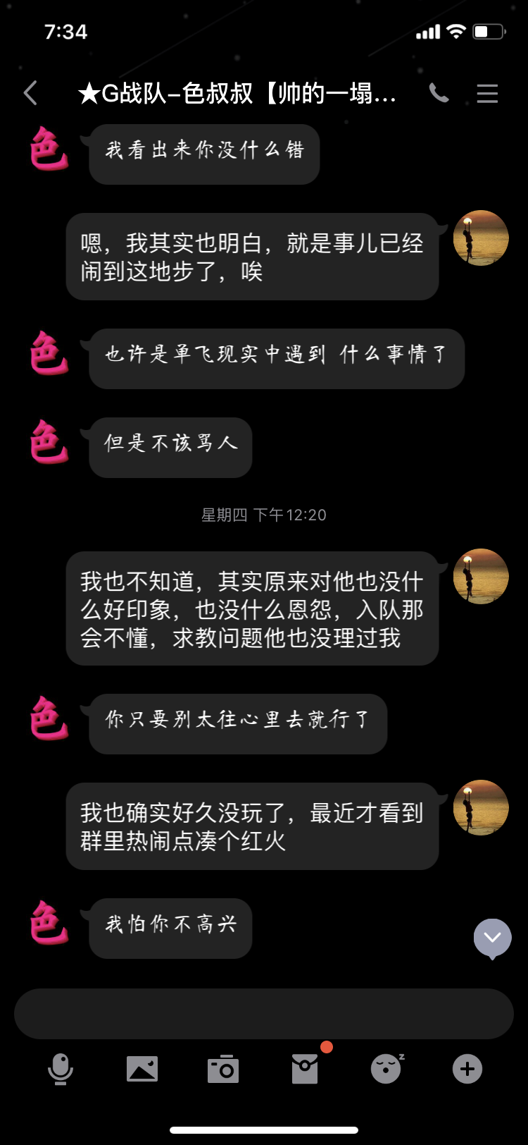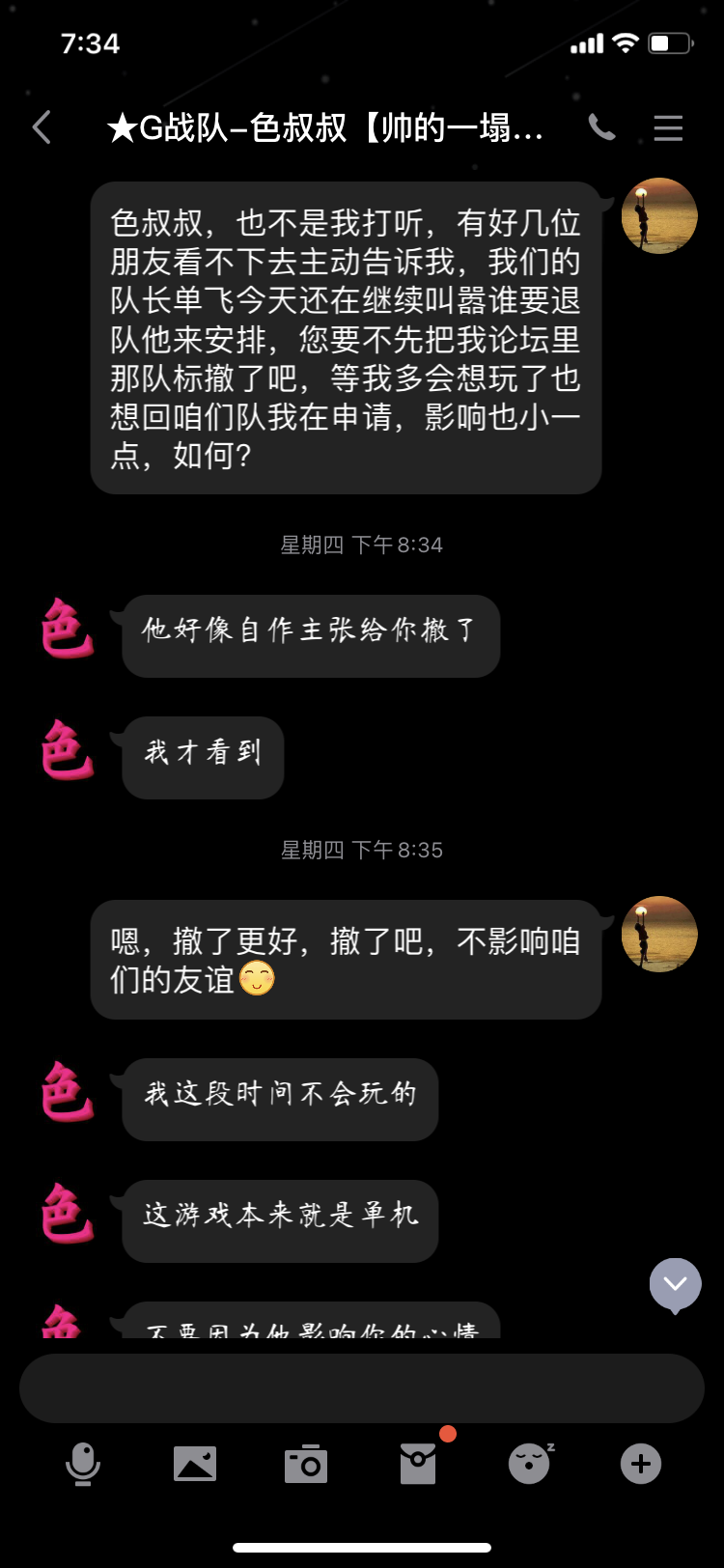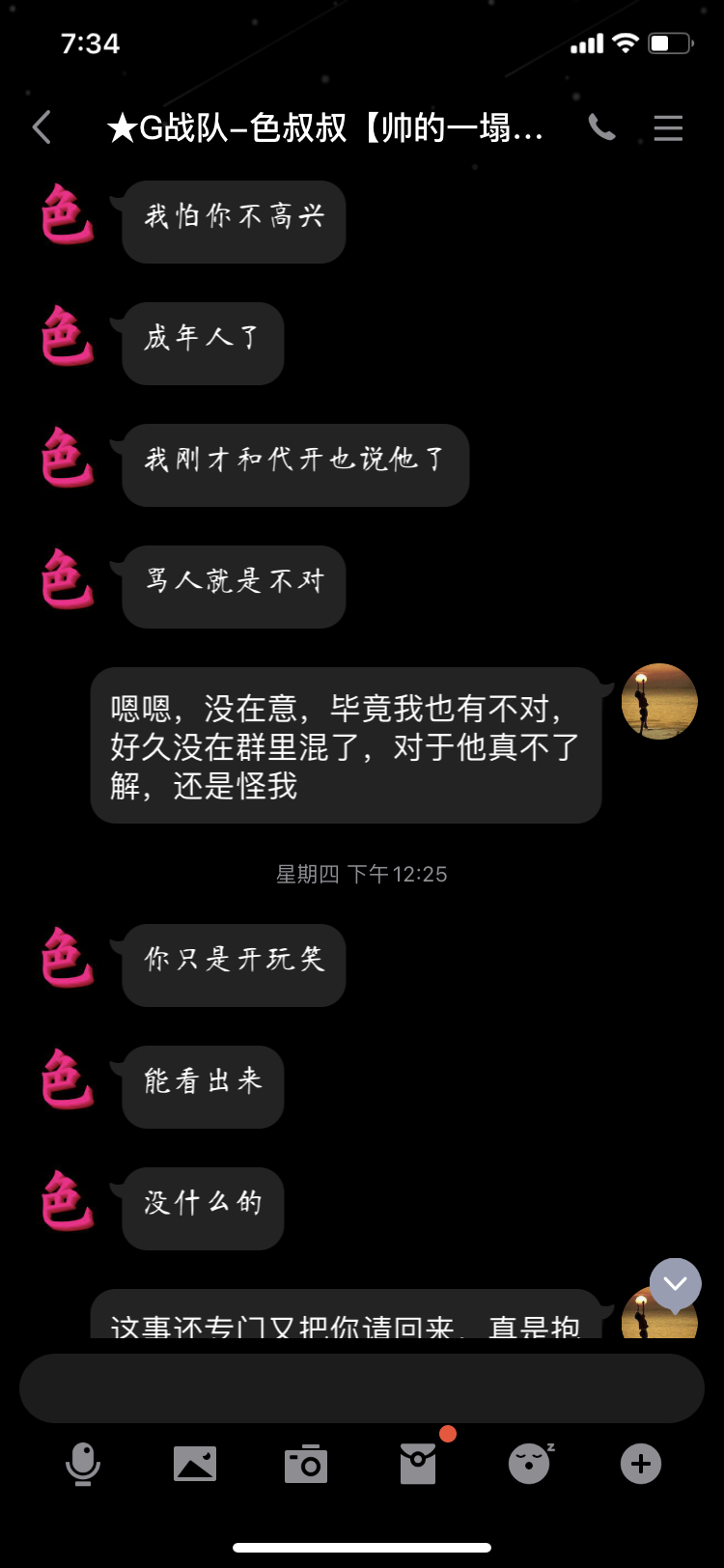 5号中午,G队创始人色叔叔加我qq好友,表明他对此事的态度,对我表示安慰,我同意将前贴沉底,不想因为一个狗杂种影响别人辛辛苦苦创立的G队。同时单飞狗逼已擅自将我从G队清理!论坛以及G队并未就此事做出任何处理。