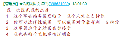 我就是这几天大闹各个群的未来!今天是最后一次发文,可能发完我就被踢了,看到的朋友都算比较幸运,欢迎把瓜转发给更多的游戏玩家!我原是g队队员,将近四年粪网的老玩家,近两年未玩游戏,四号在g队群内聊天,被g队队长单飞误认为四年前曾假借他名义送装备骗过别人的同样一个叫未来的游戏玩家,他认为此事让他赔了300多烧鸡,且影响g队荣誉,故对我无端谩骂长达一个半小时,跟他对证过程中,他自己也已意识到认错人,死不悔改,仗着他g队队长,g队版主,论坛版主身份依旧谩骂本人,本人在论坛站务群,以及g队板块发长文,并附上长达一个半小时谩骂过程所有截图,链接地址为