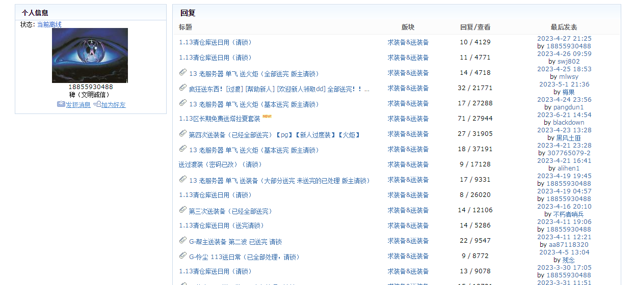 此人回复的帖子都是占便宜的帖子(送装备和文明诚信)
