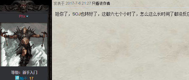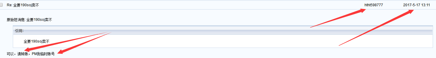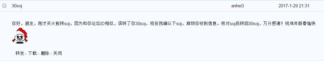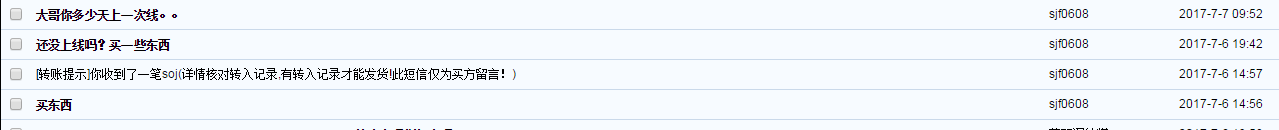 相应处理/处罚:如果买家事先未联系卖家就转账,买家在投诉前必须先用论坛短信联系卖家,标题可以是请及时交易或返回SOJ之类。短信发出的8小时内没收到回复才能在本帖申请返回SOJ(将联系卖家的短信裁图后发在回复里)。申请后SOJ会先冻结2天,2天后才能正式申请返回。