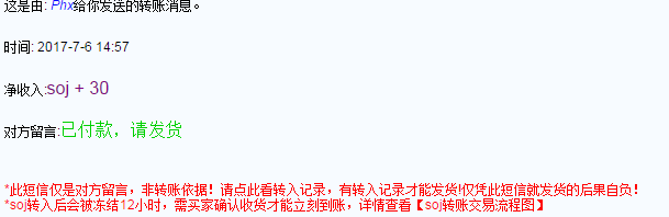 如果买家事先联系过卖家才转账(如果出现多人转账,以卖家答应时间先后为准,不以转账时间),超过24小时没有发货将立刻冻结SOJ。根据交易额度,买家购买意愿和双方会员等级,信誉等情况裁定是延时或直接返回SOJ,故意不发货或不能说明原因的视情况可罚转入SOJ的10%(最低100SOJ)。