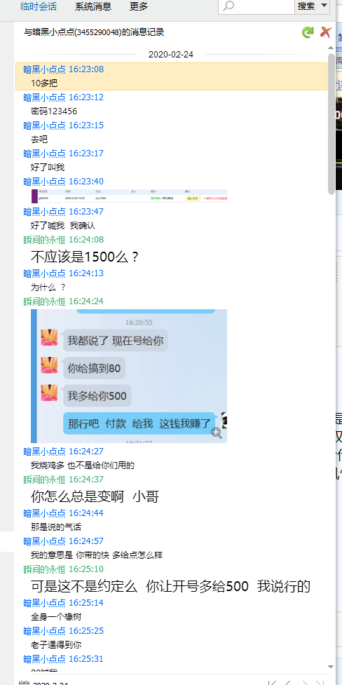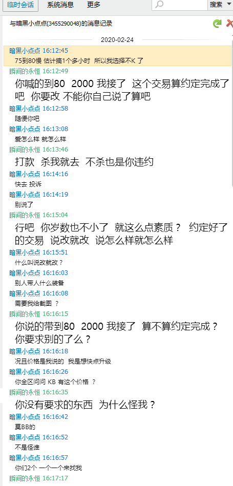 再说效率 16:23分他给的我号,刚到75的 我还和他掰扯半天 16:30才开始上他号打 我17:21 到80级让他验货 4分多一次KB速度怎么了?