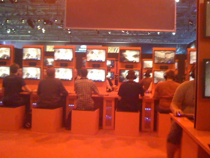 这是我趁保安转身的时候用iphone拍的质量很不好。。。 试玩厅是红色的 50台机子 屏幕是22寸Dell 鼠标和键盘raser 耳机没注意 机箱肯定搬不走 T.T 从近了试玩厅到上机还要排1个半小时左右 因为围了一圈过道 所以队一直排 上面的显示器就是为了外围排队的人看的