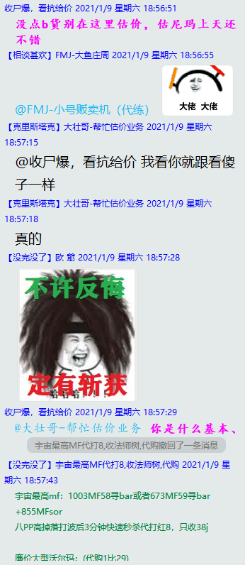因为看不到全程记录 让他截全程聊天记录图 都始终不敢截全图 这些图 还是群里的其中一个战网战友 私聊发给我的 队员老古 只是觉得这些人估价 价格不对头 就说了句憨憨 然后被斑竹骂傻子 然后把队员老古给踢了 这我没话说 但是身为版主也是骂人方的当事人 却没任何事情