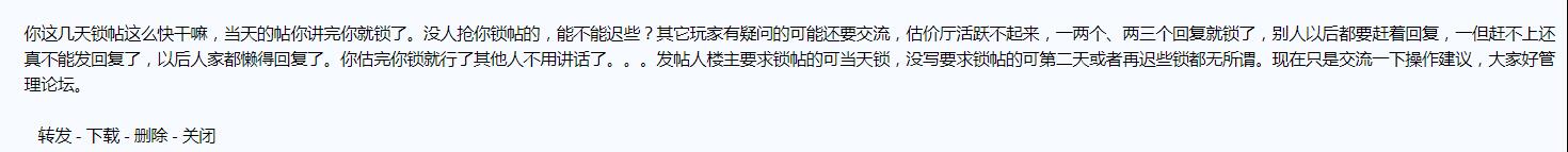 第1,锁陈年旧帖是必然的,避免交易纠纷,我也弄了一个星期,我也半夜还在锁,作为版主就要配合一起做,现在变成我安排你做了?当时我和你讲过作为版主必然要经历磨练,受到敬仰与挑衅,不可能被万人崇拜的,这些对话我对你讲了。只是少数个别玩家开涮,被人家开涮和玩家解释清楚原因就可以,非要把自己当神一样每个玩家都崇拜你才高兴啊?就算是别的区版主,也被人开过涮,在论坛也被骂过,也有人投诉过别的区版主,你可问问别的区版主有没有被开涮或者被投诉过。做为版主谁不是顶着压力在做事啊。