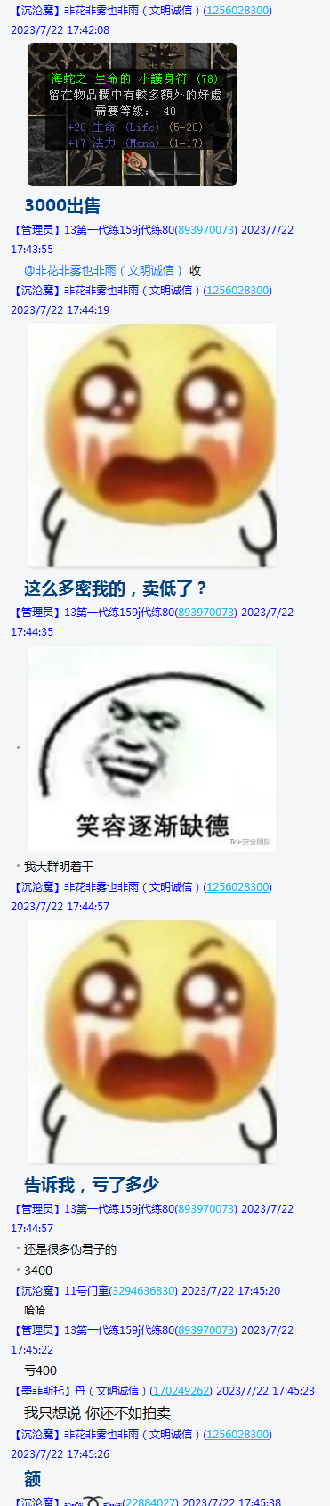 有图有真相,买卖装备价格合适就买了很正常吧?不都是私聊论坛账号转soj房间交易吗?难道先群里@(艾特)一下在私聊在走这流程?不说没有,咱不说这样有错,但是没必要语言攻击吧!有人低价卖装备正好很多人喜欢,没抢到的就在群里攻击人家?何况还是管理员,当管理要做个表率吧。其他管理都很好啊。