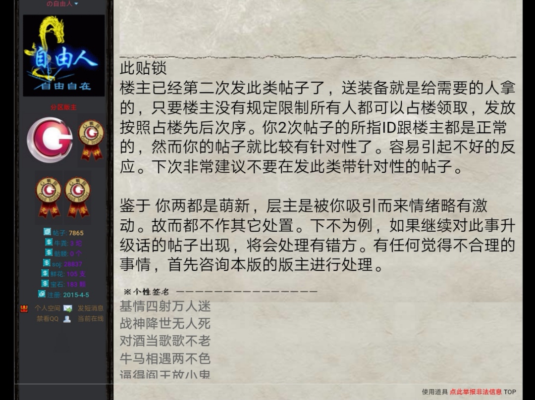 但是不久前发生的事情让我感到很迷茫,需要大版主来答疑解惑:本人曾发表2个帖子,一个帖子是“新人求不到啊”,之所以发表这个帖子,是因为有大佬送法师火炬,马上就被一位2013年注册有3000多soj的玩家领取了。另一个帖子是“前三甲”,发表这个帖子的初衷是看到送装备的大佬和领装备的前三名竟然都是一个战队,第一个帖子是默默无闻,但是第二个帖子有了几个回帖,并且和其中一位领装备者发生一些争执。最后分区版主锁帖时说我这两个帖子有针对性,并且说鉴于我是一个萌新,这次就免于处罚。