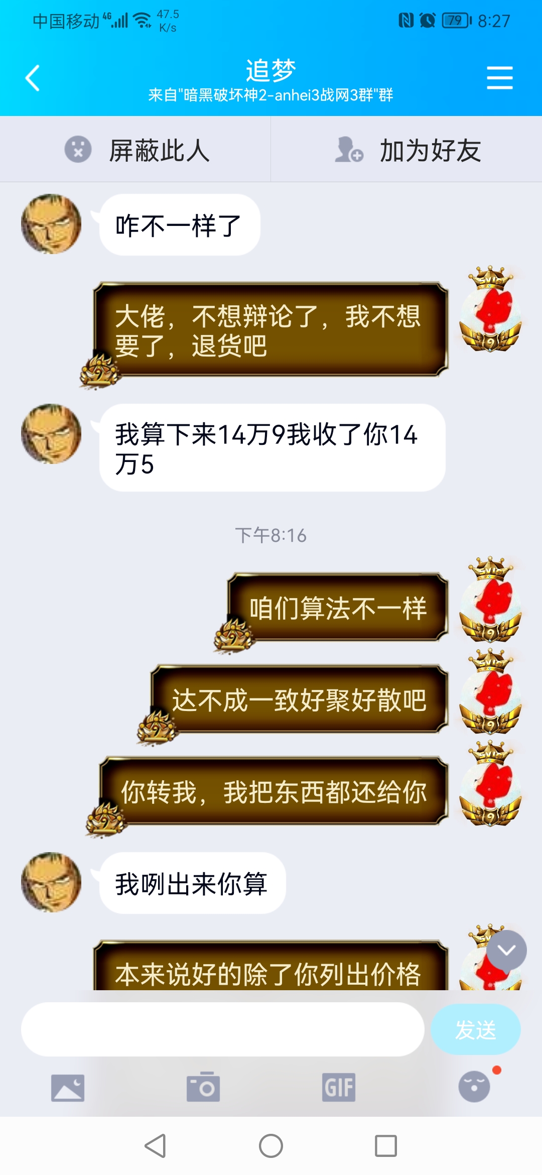 具体情况是:他在3群发消息,出售电法装备,打包优惠,我提出打包购买,他列出价格后表示其他装备全送。我同意交易,让他计算总价,然后我付款给他,之后他又说付少了,我又转给他第二笔,两笔一共148000烧鸡。这时我确实因为相信对方,没有计算价格。然后对方给我装备后,我点击了确认收货。这时我感觉东西不太对,计算了下价格,发现和他列举的价格不一致。和他反复协商,他改口称当初承诺送的装备也要算在给我的总价里。我和他协商如果这样那就取消交易,对方不同意,并立刻转走了所有烧鸡。有聊天截图。