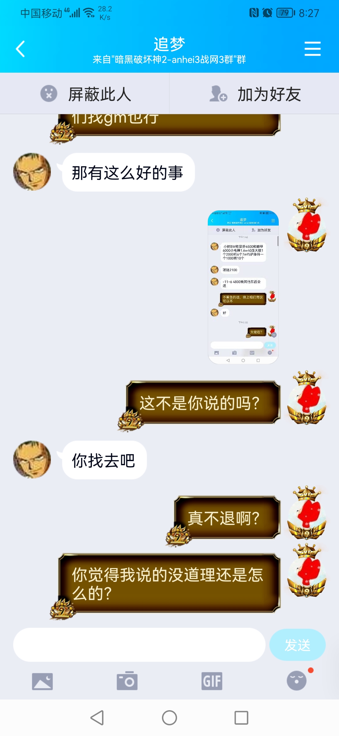 GM您好,刚才我和一名玩家进行交易,交易后我发现交易和当初描述不符,我要求退货,对方不同意。而且现在已经将我转他的烧鸡立刻转移到其他账号。对方账号:kscs0027048,对方游戏账号:kkkpk005,角色名字:too-light,游戏房间:S211,密码:1,国度:上海。交易时间:约今天晚上8点左右。