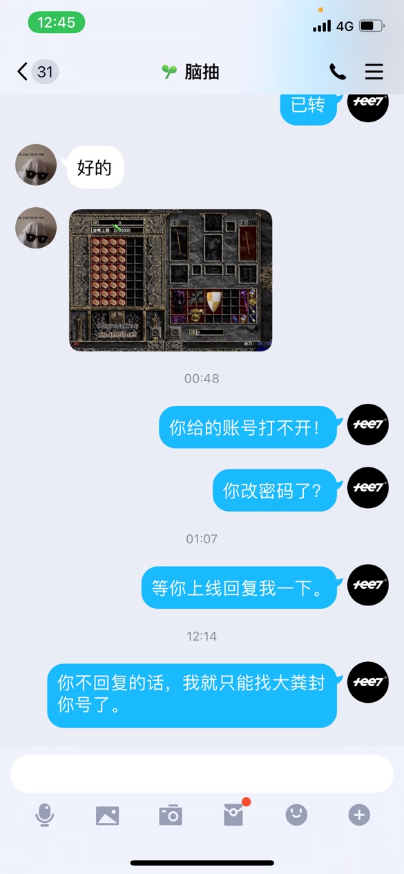 4.内容补充:前一天他购买我整套人物装备,价格讲好7500J,他只有1500J,付给我之后,说他有几个大号符文给朋友了,明天可以要回来,能凑6000J(还是我帮他算的,他自己都不知道值那么多,有30,32和27号),他让我把装备先给他玩,我就给他了,第二天他找我说朋友把符文用掉了,东西买不起了,退给我,让我退烧鸡,他说把东西全部放在一个账号让我去取,我当时大年初一在丈母娘家没法登陆,我就先把1500烧鸡退给他了。但是我晚上回家去去装备的时候发现这个账号和密码是登陆不上去的。麻烦请管理员登陆这个账号取回我的装备。如果装备已经没了,请封号此人以及先至少退还我1500烧鸡(我查了他id刚刚好有我退返的1500烧鸡),此人qq和论坛id一样都是 2859017795 在玩家一群,应该是个新人之前没见过